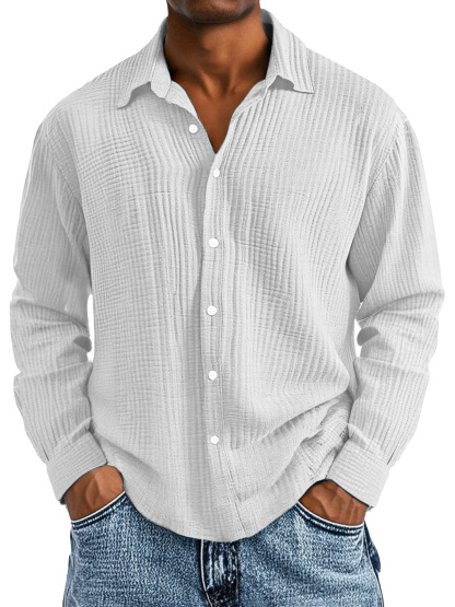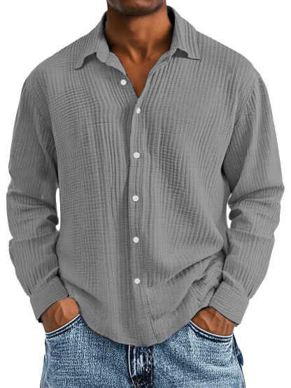 Men's Casual Cotton Pleated Solid Color Lapel Long Sleeve Shirt