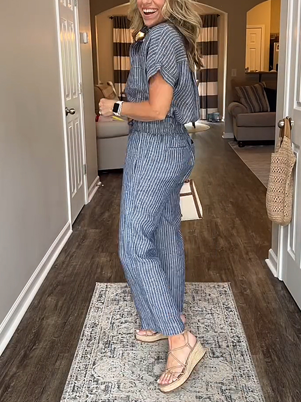 This cotton and linen striped classic pocket shirt set combines elegance with casual simplicity for any occasion.
